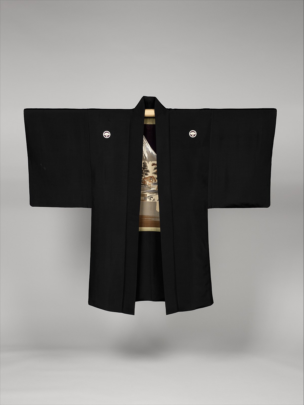 Traditional men’s formal jacket. Usually silk and usually with simple outside design and a rich story embellishing the inside lining. Often have “Mon” or “family crest” on shoulders, sleeves and back.