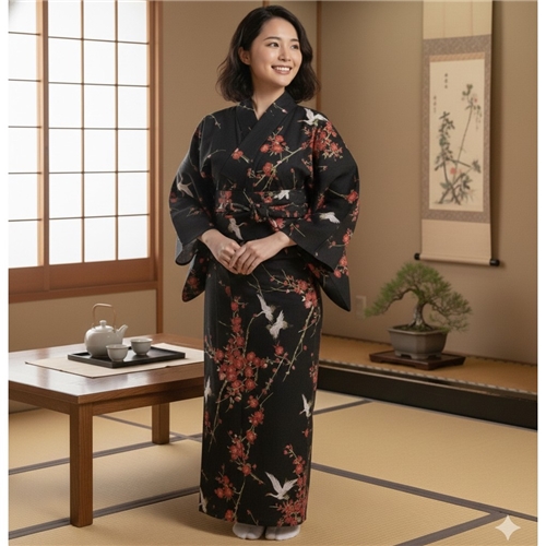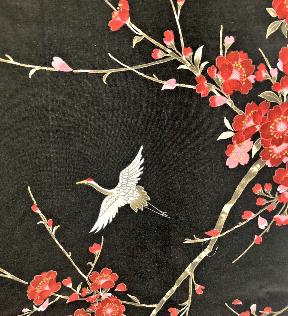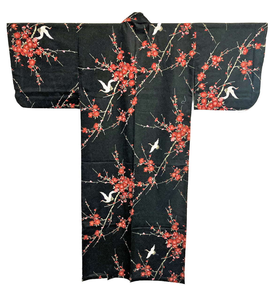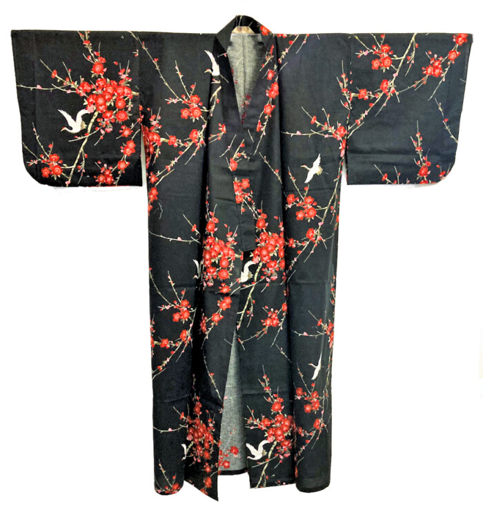 - 100% cotton printed โcherry blossomsโ Womenโs Yukata with gold highlights.
