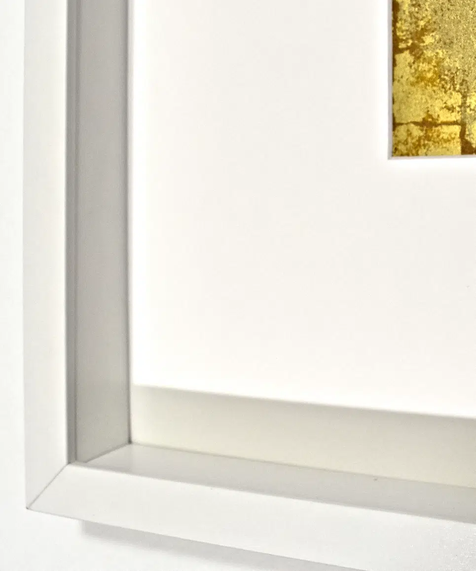 White recessed box frame with Perspex glass (Postage safety reasons). Bevelled white board picture surround. Hardware attached for easy wall hanging.