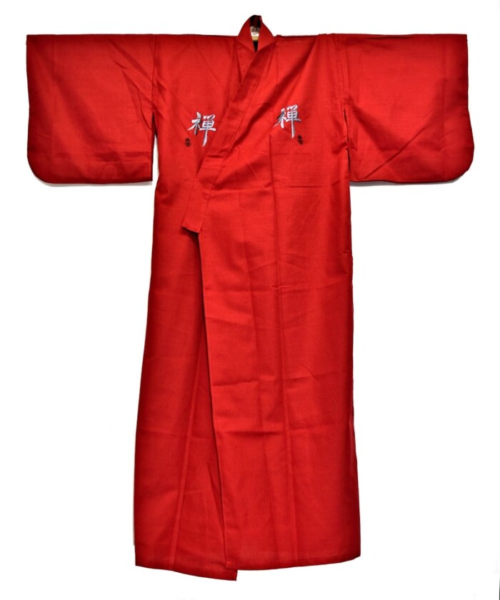 - Embroidered character meaning ‘Zen’ in rich silver cotton thread on red gown.